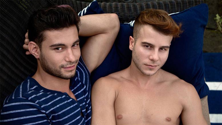 At the pool Allen King & Danny Montero are more interested in flirting than inflating all the pool toys. They don’t even make a dent in the task before Allen gives up and suggests they take a break. Without hesitation a giddy Danny starts kissing Allen and goes down on him and Allen’s fatigue magically disappears! In fact Allen is energized by Danny’s cocksucking and takes him over to the lounge chair to face-fuck him and suck him right back. bringing a big smile to his face. Showing no signs of slowing down Allen pushes Danny backwards to rim him, tease him with his cock, and get inside him.