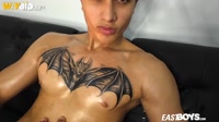 Here it is, the main video with Rafael Monteluz and his wild handjob session, where our new Mr. Handjob Junior dives in with full passion and intensity! This stunning muscular Latino stud with an angelic face, short curly hair, and a ripped athletic body gets fully worshipped for the very first time on camera. Across his powerful, sculpted pecs stretches a bold bat tattoo that makes his chest look even more irresistible. Mr. Handjob Junior dives in eagerly, his hands glide over Rafael's oiled-up muscles, squeezing those firm pecs, tracing the bat tattoo, rubbing tight abs and strong thighs until every inch shines. He teases sensitive nipples, then moves lower to those massive heavy balls. Rafael's thick, veiny cock stands rock-hard and throbbing as Junior wraps his fingers around it, stroking slow and firm, twisting around the swollen head while those full balls bounce with every pump. Rafael moans deeply, thrusts into the grip, clearly loving this new intense sensation. The handjob builds fast, muscles flexing, abs tightening, until he explodes with thick white ropes of cum shooting across his tattooed chest and ripped stomach, while Junior milks every last drop out of that veiny beast. Pure muscle worship, oil play, big veiny cock stroking, heavy balls teasing, and a massive explosive cumshot. Rafael Monteluz delivers raw pleasure in his debut scene. Only and exclusively on EastBoys.com!